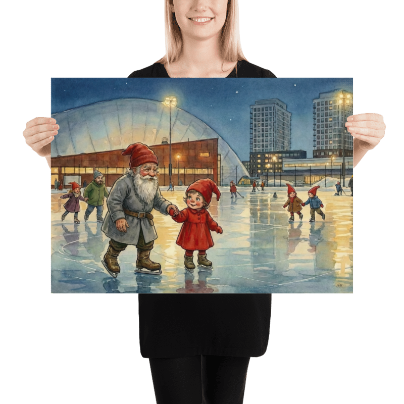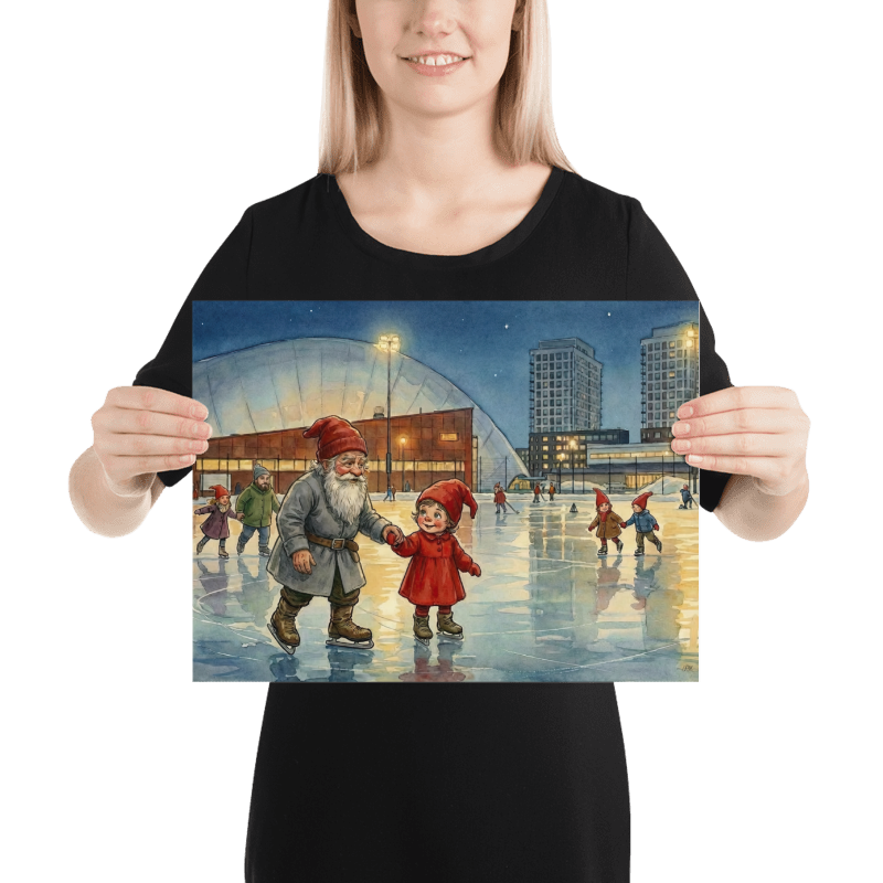 Vauhtia ja valoja Jätkäsaaren illassa. Tämä näyttävä, korkealaatuiselle paperille painettu juliste tuo Ukko-tontun ja pienen Nupun luisteluhetken osaksi sisustusta. Teoksen pehmeä vesivärityyli ja sinisen hetken sävyt pääsevät suuressa koossa upeasti oikeuksiinsa. Saatavilla koot 30x40 cm ja 50x70 cm.