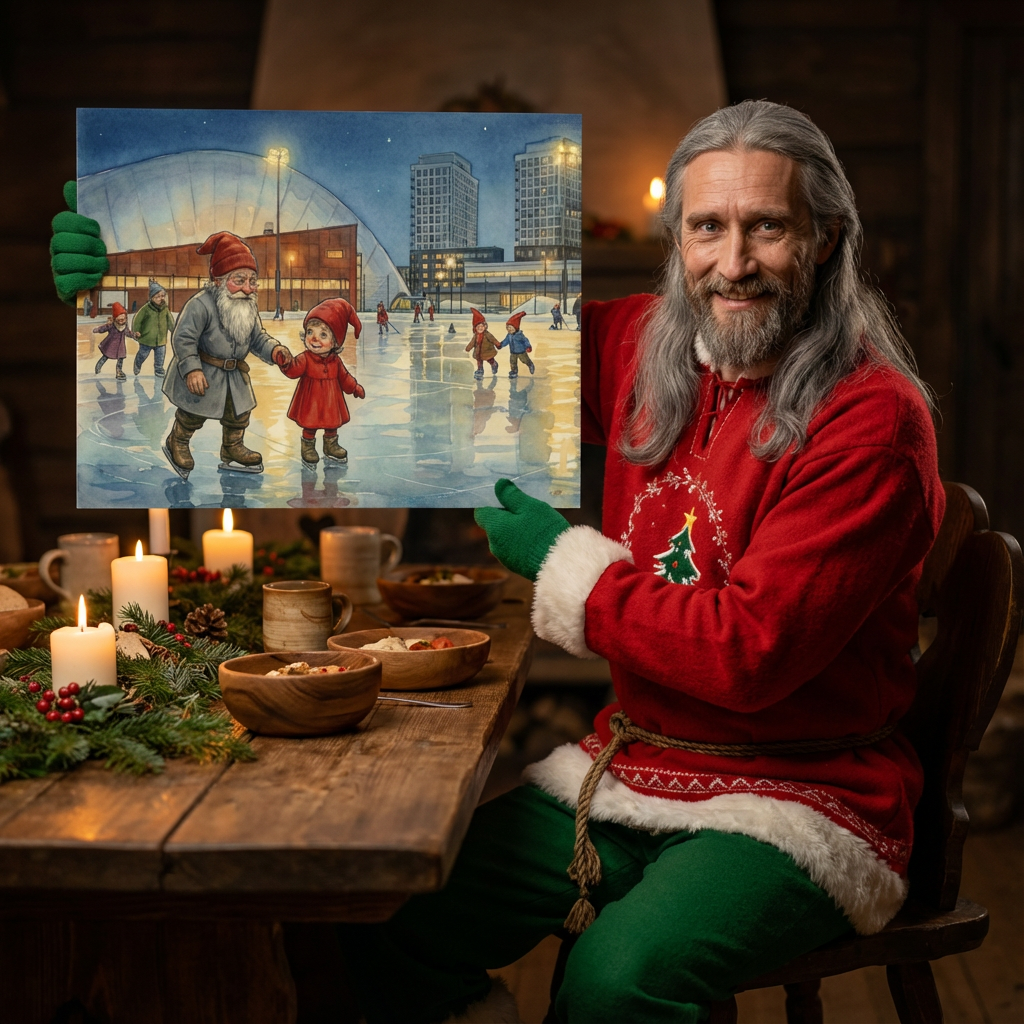 Jätkäsaaren rannassa merituuli puhaltaa suoraan ulapalta, mutta korkeat rakennukset antavat suojaa luistinkentälle. Ukko on vaihtanut vanhat huopikkaansa luistimiin ja ottanut pienen Nupun mukaansa iltaluistelulle. He viilettävät jään poikki käsi kädessä – Ukon ote on vakaa ja ohjaava, kun taas Nupun askeleissa on puhdasta intoa ja yritystä. Taustalla Helsingin uudet kerrostalot ja katuvalot luovat modernin kehyksen tälle ikiaikaiselle ilolle. Tässä hetkessä ei pönötetä, vaan nautitaan vauhdista ja yhdessäolosta keskellä kaupungin sykettä.